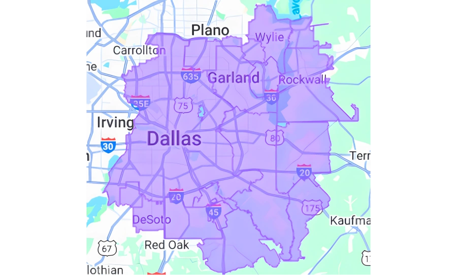 Mesquite, Dallas, Garland, Sunnyvale, Balch Springs, Rowlett, Rockwall, Forney, Terrell, Seagoville, Sachse, Wylie, Murphy, Richardson, Plano, Carrollton, Farmers Branch, Irving, Grand Prairie, Duncanville, DeSoto, Lancaster, Red Oak, Wilmer, Hutchins, Heath, Fate, Lavon, and Combine.